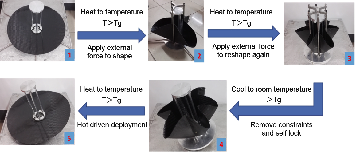 A spatially deployable parabolic reflector based on intelligent transformation composite materials, prepared using carbon fiber reinforced intelligent transformation composite materials. Compared to traditional mechanical deployable reflectors, it has the characteristics of lightweight, high aspect ratio, self locking, and thermal driven deployment, making it suitable for high-resolution and high-throughput space observation and communication fields. |