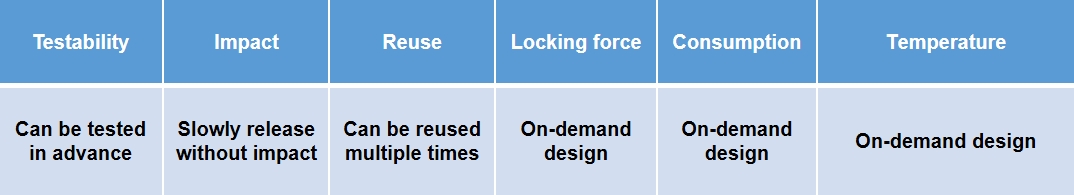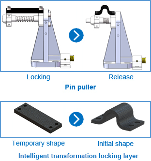 The pull-out pin based on intelligent transformation polymer composite material utilizes the variable stiffness and intelligent transformation effect of the transformation locking layer to achieve structural locking and release, with advantages such as simple structure, low impact, reusability, and high reliability. The locking state of the locking plate layer is in a straight shape, which can achieve a large axial locking force; After unfolding, it forms an Ω shape and can provide a large release stroke. |